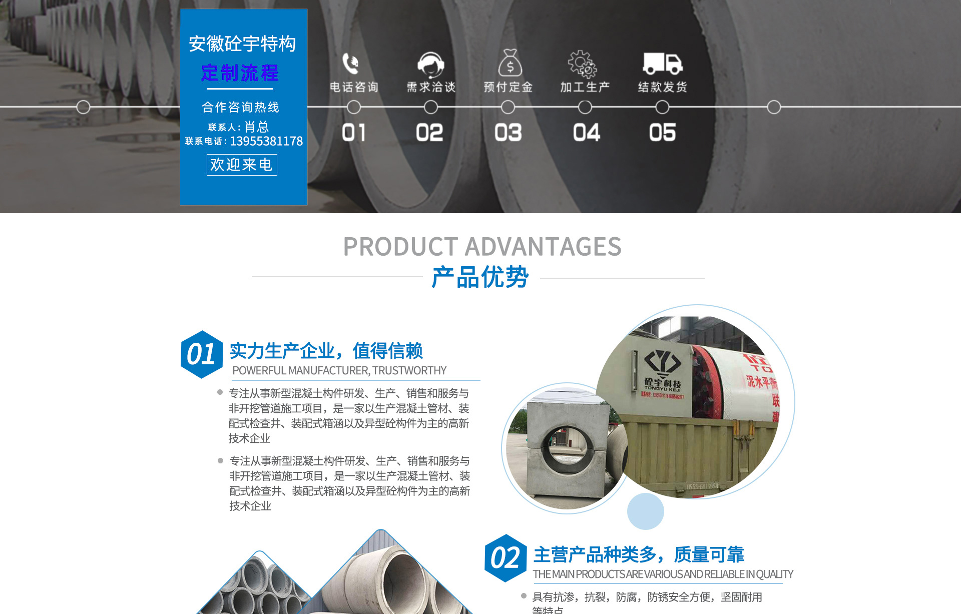 安徽砼宇特構科技有限公司創建于2005年10月,注冊資本3000萬元注冊資金,總部位于安徽省蕪湖市省級裝配式建筑產業園區。是一家以生產混凝土排水管、檢查井、箱涵、住房裝配化及異型砼構件為主的高新技術企業。生產基地占地60000㎡,現有員工90多人,中、高等級職稱技術人員20多人,具有試驗室,嚴格控制產品質量,使產品出廠合格率高。 公司共取得了國家發明4項,實用新型發明9項,受理發明9項,安徽省科技成果1項,安徽省高新技術產品5項,安徽省科技新產品5項,是安徽省專精特新中小企業、蕪湖市科技創新“小巨人”企業,參與制定建材行業標準3項《預制混凝土檢查井》JC/T 2241-2014)、GB/T11836《混凝土和鋼筋混泥土排水管》、行業《預制裝配化混凝土箱涵》標準的制定。是安徽省內水泥制品砼構件和排水管行業的創新型企業。 公司具有建筑工程施工總承包二級、下設的全資子公司(全一建設)具有市政三級資質。同時我公司從事城市園林綠化、市政公用工程...